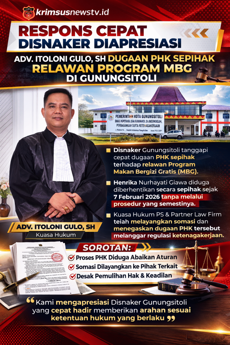 Gunungsitoli // krimsusnewstv.id — Penanganan dugaan pemutusan hubungan kerja (PHK) sepihak terhadap relawan Program Makan Bergizi Gratis (MBG) di Gunungsitoli mulai menunjukkan titik terang. Tim kuasa hukum korban, yang dipimpin Adv. Itoloni Gulo, menyampaikan apresiasi atas respons cepat Dinas Ketenagakerjaan setempat dalam menindaklanjuti persoalan tersebut. (18/03/2026)