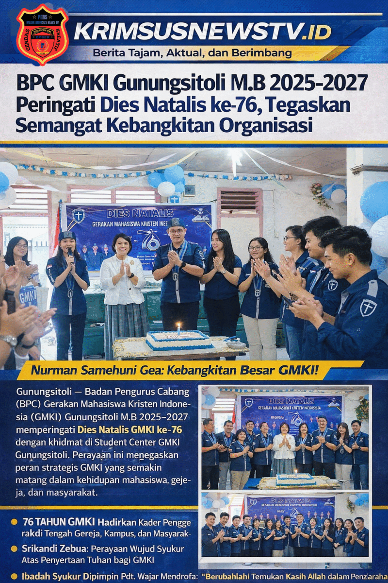 Gunungsitoli // krimsusnewstv.id – Badan Pengurus Cabang (BPC) Gerakan Mahasiswa Kristen Indonesia (GMKI) Gunungsitoli Masa Bakti 2025–2027 menggelar perayaan Dies Natalis GMKI ke-76 sebagai langkah awal penguatan gerak organisasi di awal Februari 2026. Kegiatan yang berlangsung khidmat di Student Center GMKI Gunungsitoli ini menjadi momentum mempererat solidaritas kader sekaligus menegaskan peran strategis GMKI dalam kehidupan mahasiswa, gereja, dan masyarakat. (11/12/2026)