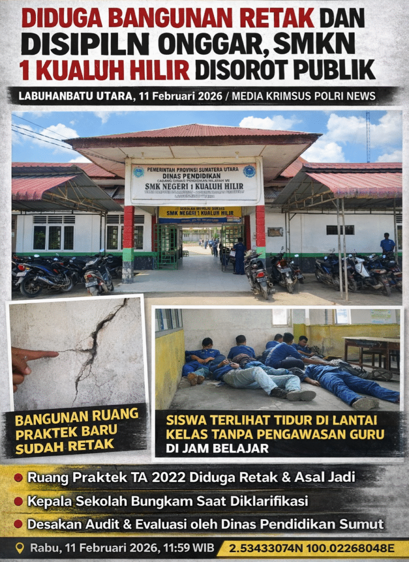 Labuhanbatu Utara // krimsusnewatv.id – 11 Februari 2026— Kondisi bangunan ruang praktik siswa di SMK Negeri 1 Kualuh Hilir, Kabupaten Labuhanbatu Utara, menuai sorotan tajam. Bangunan yang dikerjakan pada Tahun Anggaran 2022 tersebut diduga telah mengalami keretakan di sejumlah dinding, meski usianya baru sekitar tiga tahun.
