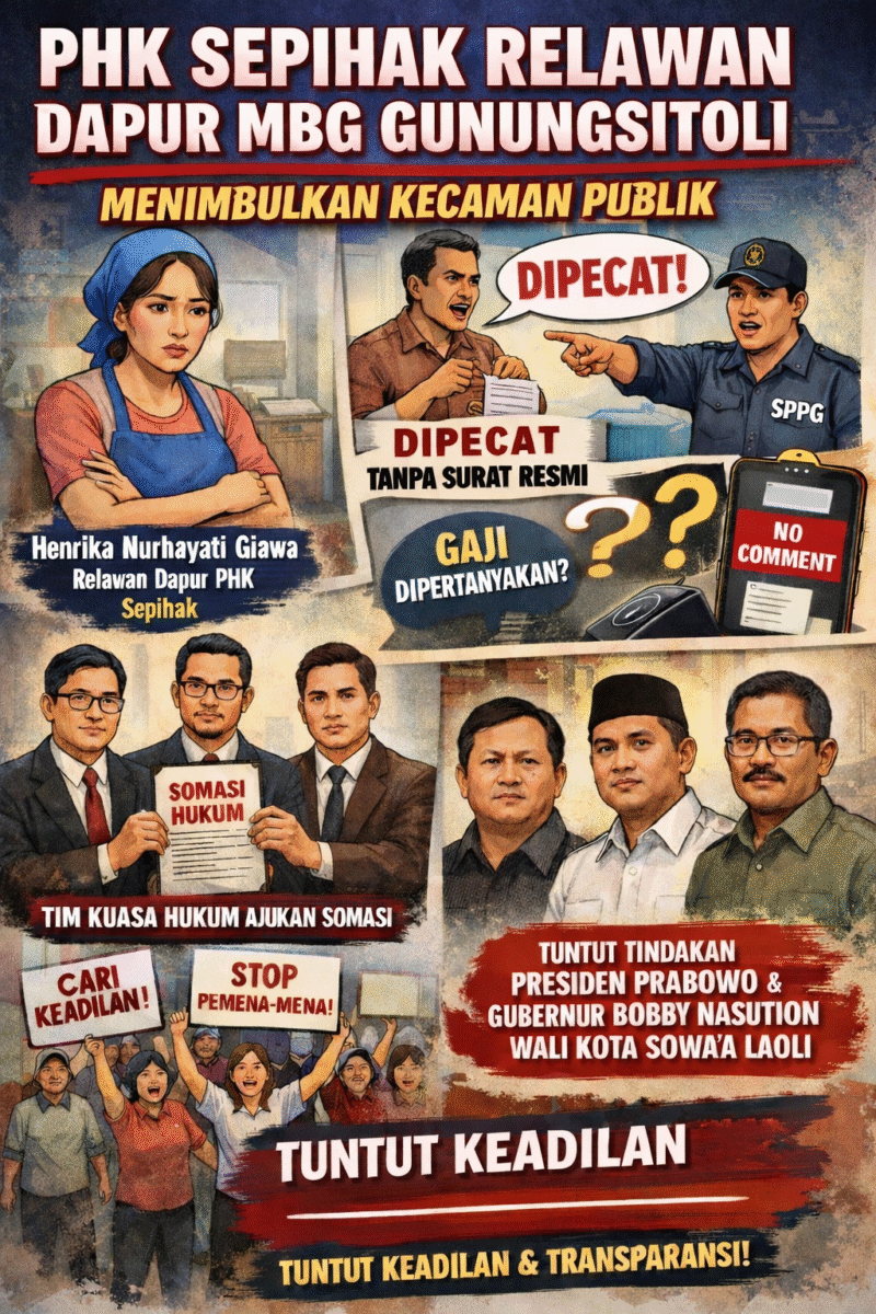Sejumlah elemen masyarakat mendesak audit dan evaluasi terhadap manajemen SPPG di Gunungsitoli. Jika dugaan pelanggaran ini benar terjadi, maka ini bukan sekadar persoalan satu orang relawan — melainkan soal kredibilitas program sosial negara dan komitmen terhadap prinsip keadilan.