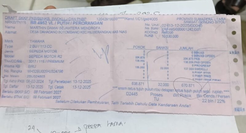Diduga Pungli Berkedok Sistem, Penarikan PKB hingga 2027 di Samsat Gunungsitoli Dipersoalkan