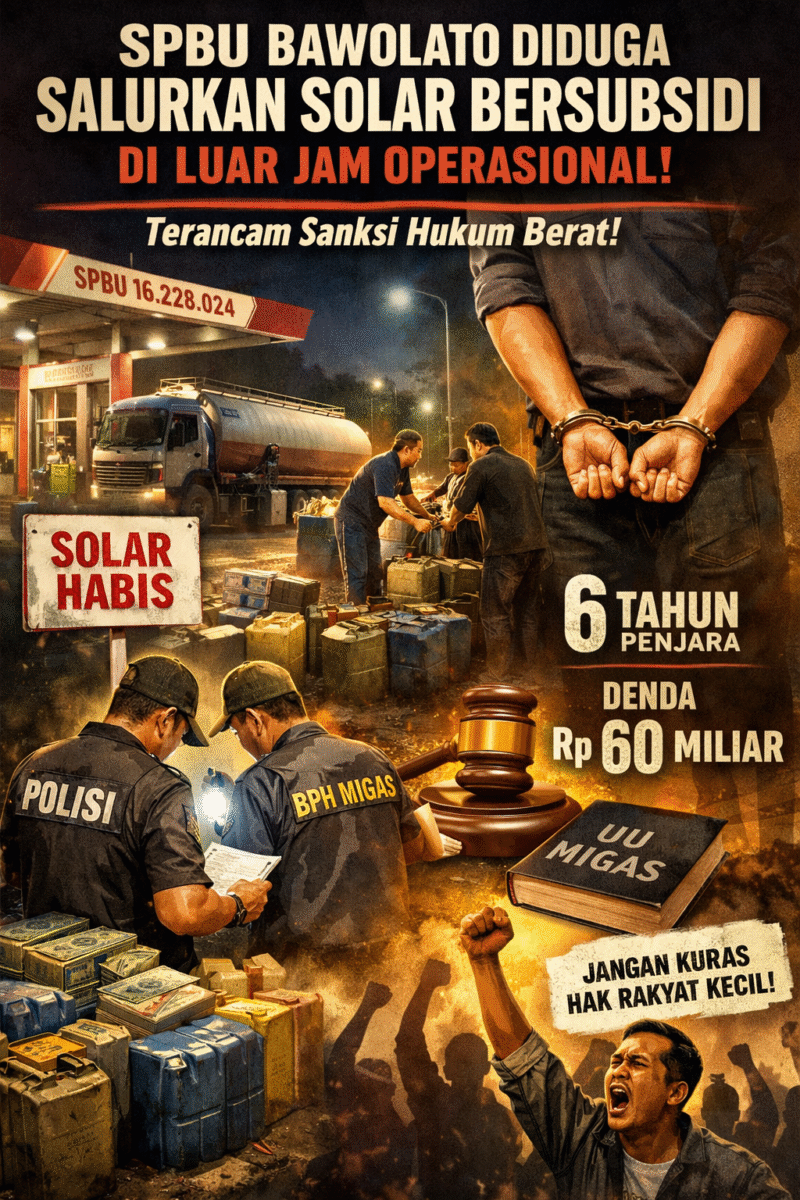 Nias // Krimsusnewstv.id — Stasiun Pengisian Bahan Bakar Umum (SPBU) 16.228.024 milik PT Elora Fam Jaya yang berlokasi di Jalan Nasional arah Tik. Dalam, Dusun II, Desa Hiliganoita, Kecamatan Bawolato, Kabupaten Nias, Sumatera Utara, menjadi sorotan publik. SPBU tersebut diduga melakukan penyaluran Bahan Bakar Minyak (BBM) bersubsidi, khususnya solar, di luar jam operasional resmi. Dugaan ini memicu kecurigaan masyarakat akan adanya potensi penyimpangan distribusi BBM subsidi. Rabu (07/01/2026).