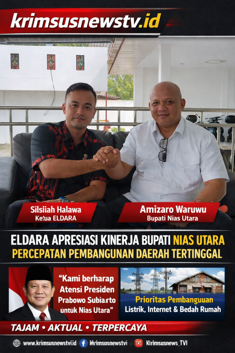 Nias Utara // krimsusnewstv.id — Komitmen Pemerintah Kabupaten Nias Utara dalam mempercepat pembangunan dan mengentaskan kemiskinan kembali mendapat dukungan publik. Ketua Elemen Muda Nias Utara (ELDARA) menyampaikan apresiasi atas langkah strategis Bupati Nias Utara, Amizaro Waruwu, dalam memperjuangkan kebutuhan dasar daerah di tingkat nasional. 26/02/2026