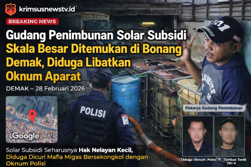 Demak, Jawa Tengah // krimsusnewstv.id  – 05 maret 2026, Dugaan praktik mafia bahan bakar minyak (BBM) bersubsidi berskala besar terungkap di wilayah Desa Purworejo, Kecamatan Bonang, Kabupaten Demak, Jawa Tengah. Sebuah gudang yang diduga menjadi lokasi penimbunan ribuan liter solar subsidi ditemukan oleh tim investigasi media pada Sabtu sore (28/02/2026).