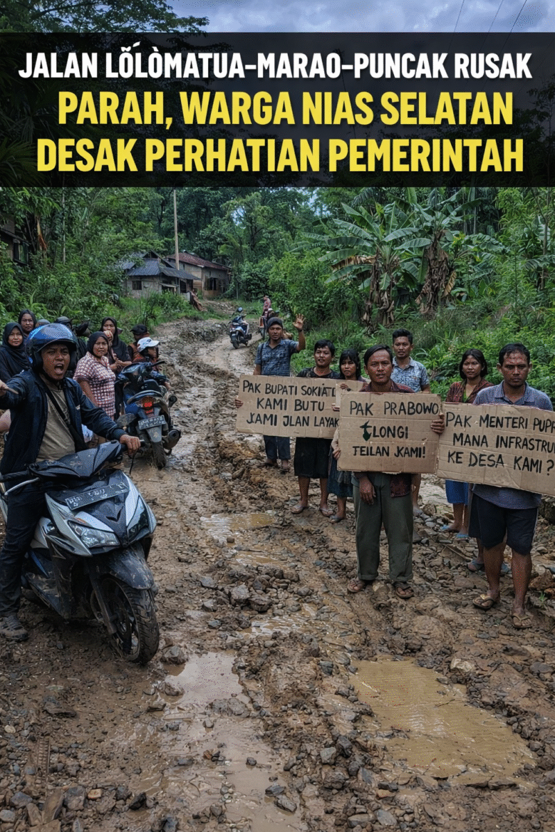 Nias Selatan // krimsusnewstv.id – Kondisi infrastruktur jalan penghubung Kecamatan Lölömatua menuju Desa Marao dan Desa Puncak lolomatua kecamatan ulunoyo, Kabupaten Nias Selatan, kembali menuai sorotan tajam publik. Hingga awal 2026, ruas jalan vital tersebut masih mengalami kerusakan berat dan belum mendapat penanganan serius, memunculkan kritik keras terhadap kinerja pemerintah daerah hingga pemerintah pusat. Senin, 12/01/2026
