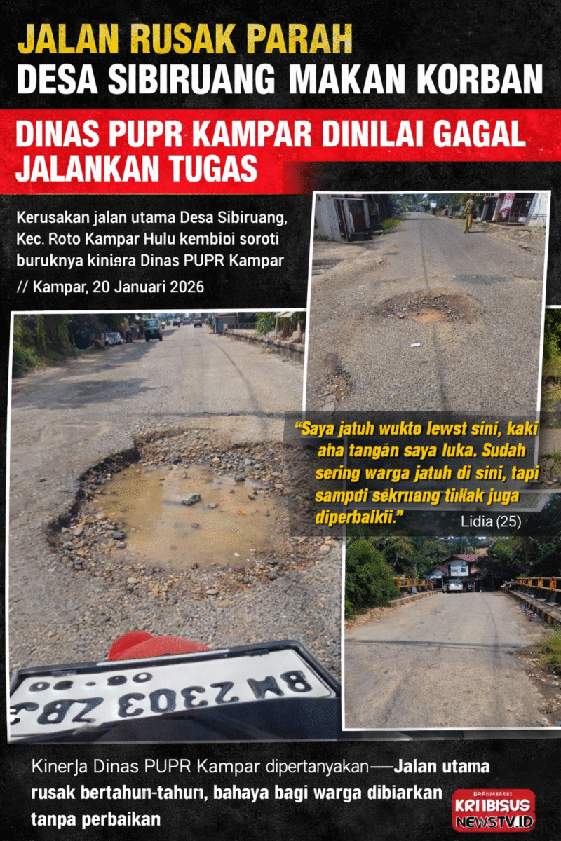 Kampar // krimsusnewstv.id – Kondisi jalan raya Desa Sibiruang, Kecamatan Koto Kampar Hulu, yang rusak parah dan memakan korban kecelakaan, kini secara terang-benderang menyeret tanggung jawab Dinas Pekerjaan Umum dan Penataan Ruang (PUPR) Kabupaten Kampar. Pembiaran kerusakan jalan ini dinilai sebagai bentuk kegagalan dinas teknis dalam menjalankan fungsi pelayanan publik.