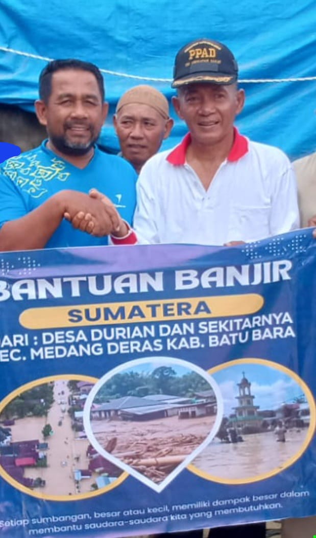 Batubara // krimsusnewstv.id — Sabtu, 20 desember 2025, Kepala Desa Durian, Jumahari, Kecamatan Medang Deras, Kabupaten Batubara, menyalurkan bantuan kemanusiaan bagi masyarakat terdampak banjir sebagai bentuk kepedulian sosial dan rasa kemanusiaan, Sabtu (13/12/2025)