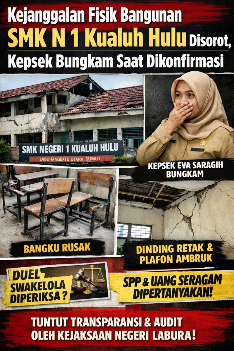Labuhanbatu utara // krimsusnewstv.id — Kondisi fisik bangunan di SMK Negeri 1 yang beralamat aek kanopan timur kec. kualuh hulu, kab. Labuhanbatu utata, sumatera utara, menuai sorotan tajam. Sejumlah ruang kelas dilaporkan mengalami kerusakan pada beberapa bagian konstruksi, mulai dari dinding yang tampak retak, struktur yang dinilai kurang kokoh, hingga fasilitas belajar seperti bangku besi yang rusak dan patah.