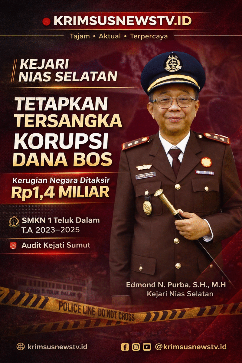 Nias Selatan // krimsusnewstv.id — Kejaksaan Negeri Nias Selatan resmi menetapkan tersangka dalam perkara dugaan tindak pidana korupsi penggunaan Dana Bantuan Operasional Sekolah (BOS) di SMKN 1 Teluk Dalam. Kerugian keuangan negara dalam kasus tersebut ditaksir mencapai sekitar Rp1,4 miliar. (20/02/2026)