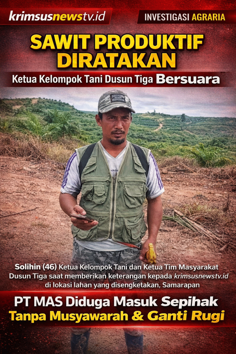 Kutai Timur // krimsusnewstv.id – Selasa, 24 februari 2026 – Konflik agraria kembali mencuat di wilayah Samarapan. Warga Dusun Tiga melalui Ketua Kelompok Tani setempat, Solihin (46), mengungkap dugaan perusakan kebun kelapa sawit milik masyarakat oleh perusahaan PT MAS sejak Agustus 2024.