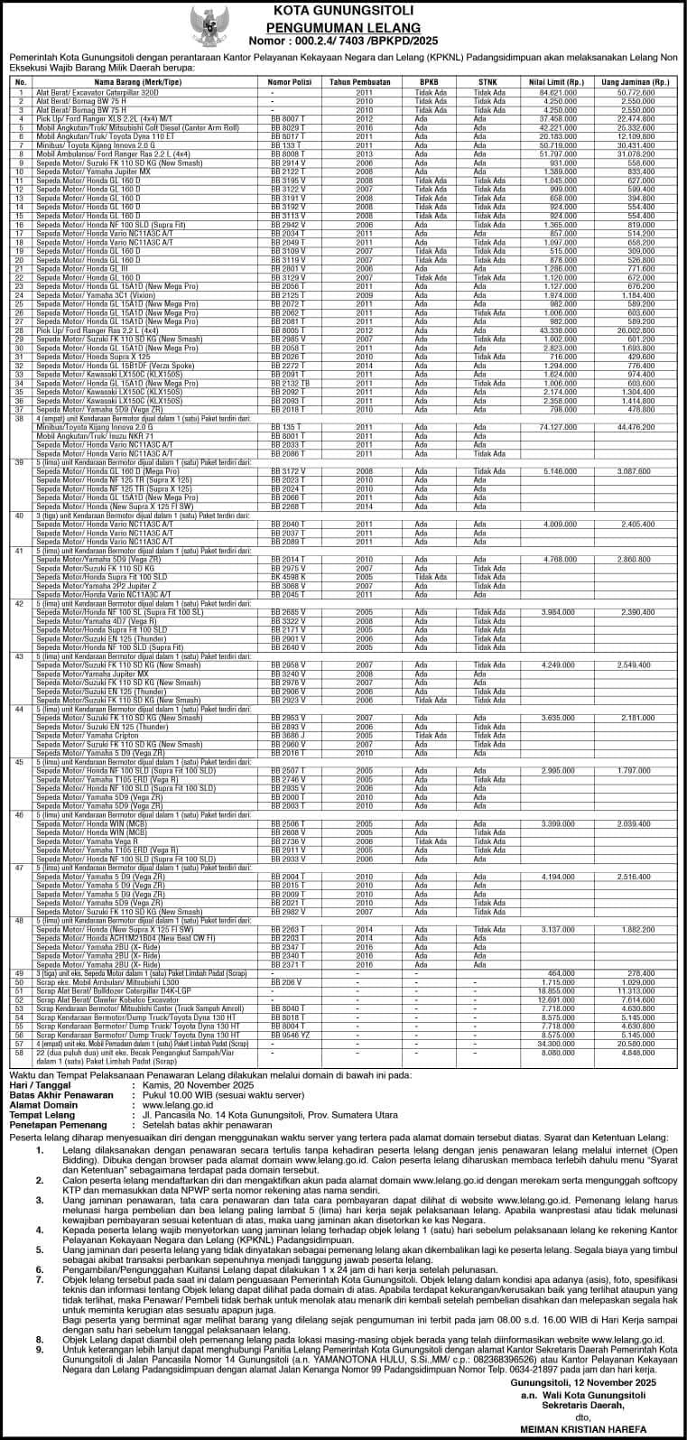 Pemko Gunungsitoli Umumkan Pelaksanaan Lelang Barang Milik Daerah 20 November 2025