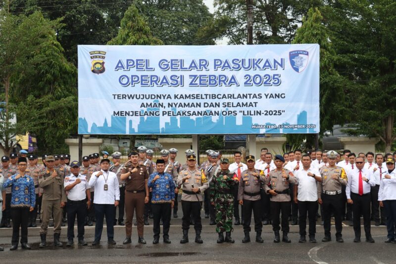 Tebo // krimsusnewstv.id — Polres Tebo melaksanakan Apel Gelar Pasukan Operasi Zebra Siginjai 2025 pada Senin, 17 November 2025, di Lapangan Mapolres Tebo. Apel dimulai pukul 07.45 WIB dipimpin langsung oleh Kapolres Tebo, AKBP Triyanto, S.I.K., S.H., M.H., serta dihadiri Forkopimda Kabupaten Tebo, Pj. Sekda Dr. Sindi, S.H., M.H., para pejabat OPD terkait, PJU Polres Tebo, unsur TNI, Brimob, dan instansi pendukung lainnya.