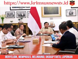 Jakarta // krimsusnewstv.id – Presiden Prabowo Subianto memimpin rapat terbatas (ratas) bersama sejumlah Menteri Kabinet Merah Putih dan Wakil Ketua DPR RI, Sufmi Ahmad Dasco, di Istana Merdeka, Jakarta, Senin (22/9/2025). Rapat ini digelar untuk memperkuat koordinasi pemerintah dalam percepatan program prioritas nasional, khususnya di bidang ekonomi dan kesejahteraan rakyat.