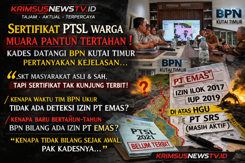 Kutai Timur // krimsusnewstv.id – Minggu, 01 maret 2026 – Polemik tak kunjung terbitnya sertifikat Program Pendaftaran Tanah Sistematis Lengkap (PTSL) tahun 2021 milik masyarakat Desa Muara Pantun kembali memanas. Kepala Desa Muara Pantun, Muhamad Ali Firdaus, pada 15 Oktober 2024 yang lalu telah mendatangi Kantor Badan Pertanahan Nasional (BPN) Kabupaten Kutai Timur untuk meminta kejelasan atas mandeknya penerbitan sertifikat warganya.