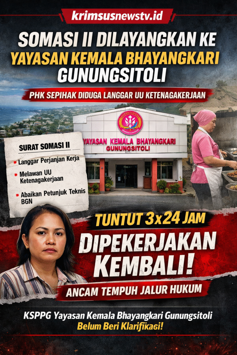 Gunungsitoli // krimsusnewstv.id Dugaan pemutusan hubungan kerja (PHK) sepihak kembali mencuat di Kota Gunungsitoli. Seorang pekerja di Satuan Pelayanan Pemenuhan Gizi (SPPG) Yayasan Kemala Bhayangkari Kota Gunungsitoli resmi melayangkan Somasi (Teguran Hukum) II melalui kuasa hukum Adv. Itoloni Gulo, SH, Adv. Fasa’aro zaluhku, SH, Adv. Agustinus Bu’ulolo, SH., MH, Adv. Paulus Peringatan Gulo, SH., MH dari Kantor hukum PS & Partner Law Firm yang beralamat Jl. Jalak XV No. 332, Kelurahan, Kenangan, Kecamatan Percut, Sei Tuan, Kabupaten Deli Serdang – Sumatera Utara.